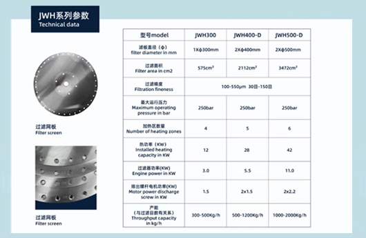 • 1.我們的JWH系列是雙過濾板設計,有效過濾面積比市面上的激光網板大很多,可以有效減小濾網前的物料壓力。過濾面積越大代表濾網板的壽命越長。